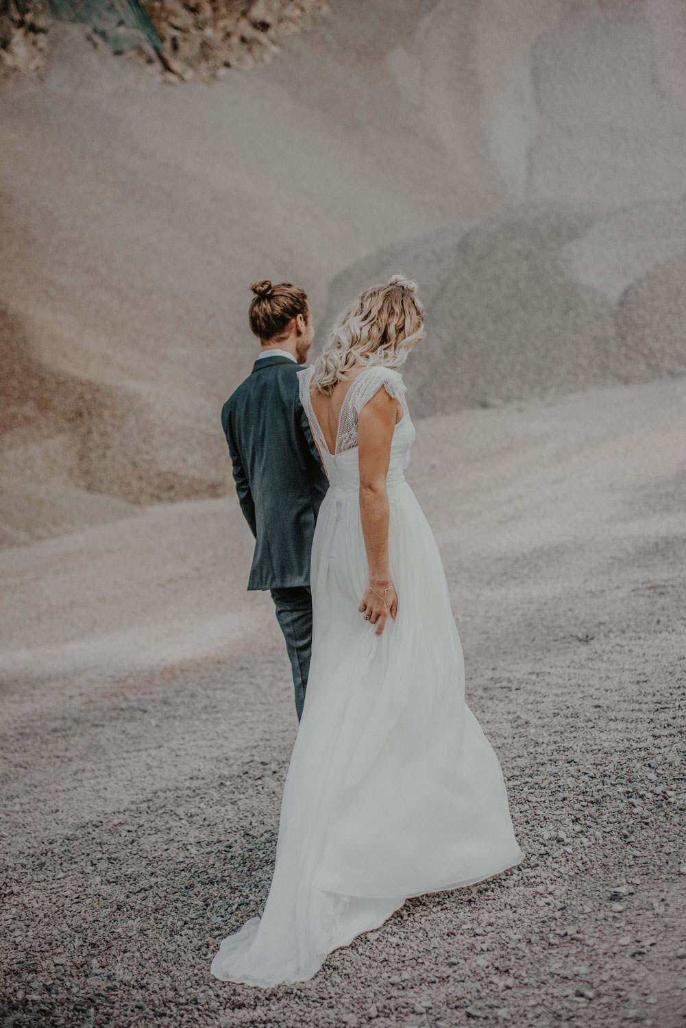 Für eine helle, klare und minimalistische Sprache steht das skandinavische Design, an dem wir uns für dieses Styled Shooting inspirierten. In einem kleinen Steinbruch erschufen wir eine Szenerie, bei der eine ungezwungene Modernität und der Minimalismus Gestaltungskriterium war. Es war eine großartige Aufgabe aus natürlichen Materialien, fließenden Stoffen, einer reduzierten Farbpalette und minimalistische Blumenarrangements ein modernes Hochzeitskonzept zu erschaffen.